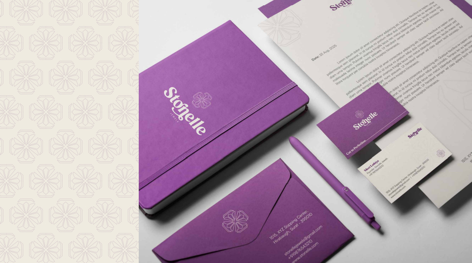 The color palette of Deep Royal Purple and Off-White evokes royalty, creativity, and elegance, perfectly aligning with Stonelle’s refined audience. We extended this design language into stationery, packaging, and digital presence, ensuring consistency across every brand touchpoint.